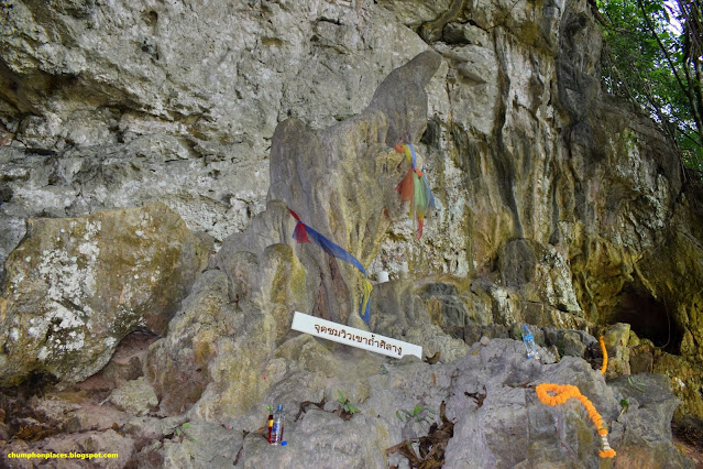 Sila Snake cave is a small cave under a large overhang.The cave was named after villagers saw a large snake. Some of the rock formations they consider are in the shape of snakes.As the cave is at a fairly high elevation it affords a nice view eastwards.Across the valley you can also see the flag on the summit of Khao Roi Yot where the viewpoint is.To get to the viewpoint you have to take a small track about 50m back along the concrete road. This track takes you to the base of the hill where it is an easy 200m climb to the summit. However this is not easy to find so best to ask Mr Long (ลอง) on 085-7841968 who lives at the house by the T junction. He kindly showed us the way to the summit.